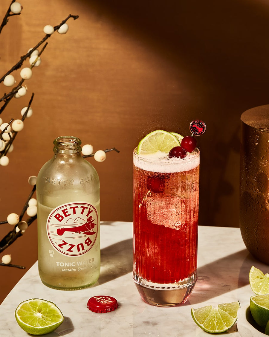 Over ice, combine the gin (if desired), cranberry juice and lime juice in a glass. Top with Betty Buzz Tonic Water and garnish with a lime wheel and toothpicked cranberries.