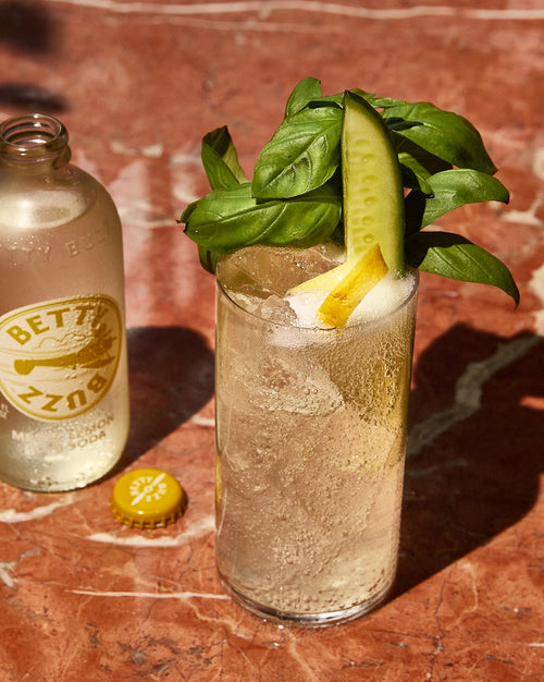 In the bottom of a shaker, muddle cucumber slices and simple syrup. Add gin, along with ice, and shake. Strain over fresh ice into a Collins glass, then top with Betty Buzz Meyer Lemon Club Soda. Garnish with a mint sprig or basil leaves.